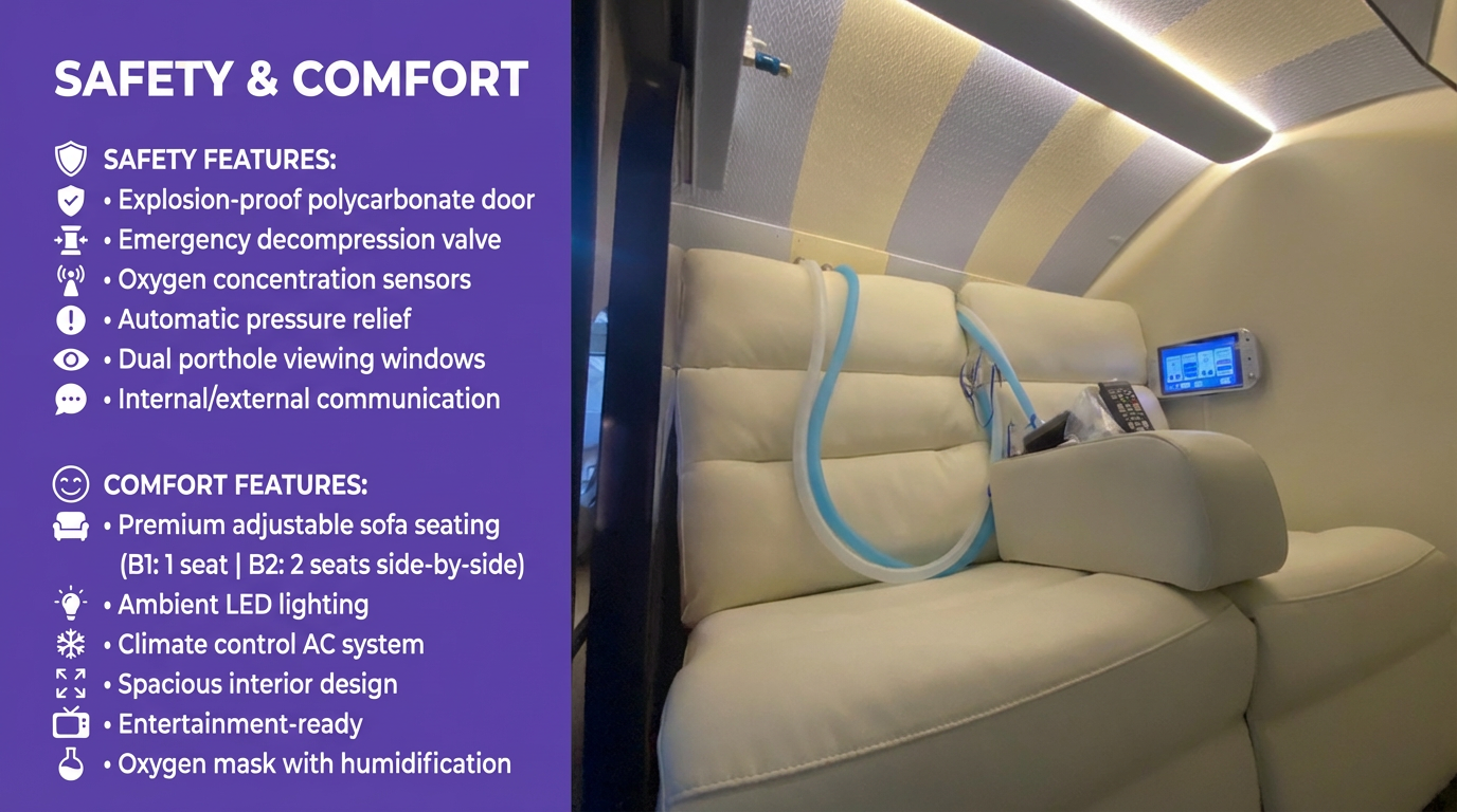 • ⚙️ Adjustable pressure control (1.0-2.0 ATA)